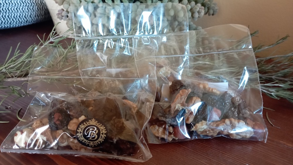 Összetevők: aszalt füge, dió, pirított mogyoró, fahéjas aszalt meggy,