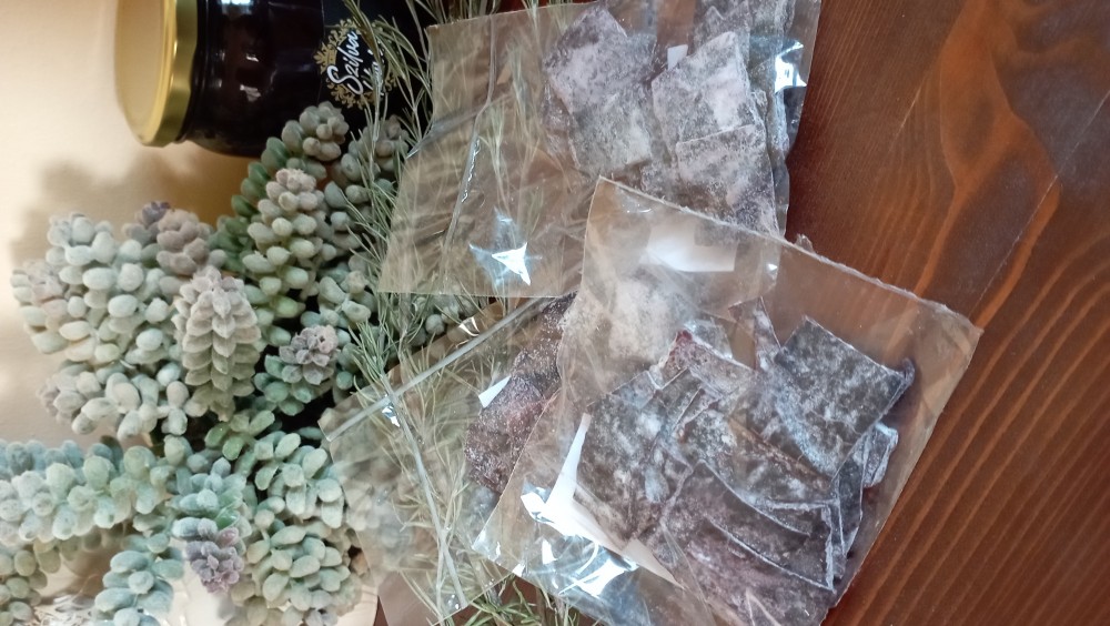 Aszalt szilva lapok, melyeket kis kockákra szeltünk a könnyebb fogyaszthatóság érdekében.